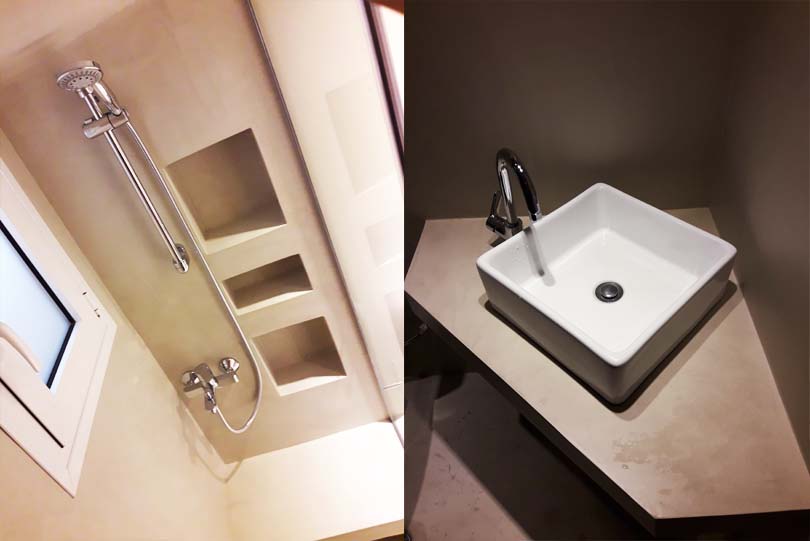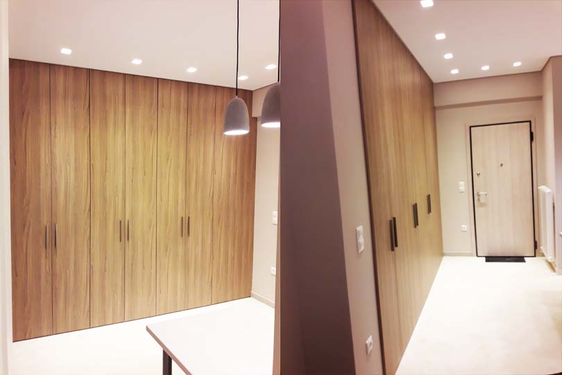 Το διαμέρισμα αυτό βρίσκεται στον 1ο όροφο πολυκατοικίας στο κέντρο της Αθήνας. Στο συγκεκριμένο διαμέρισμα η πρόκληση που είχαμε να αντιμετωπίσουμε ήταν στο να μπορέσουμε να εκμεταλλευτούμε και το παραμικρό τετραγωνικό εκατοστό αυτού ώστε να υπάρχει η δυνατότητα να φιλοξενηθεί ένα σύγχρονο ζευγάρι με τις ανάγκες του. Οι βασικές αλλαγές που έγιναν στον σχεδιασμό της ανακαίνισης αυτής ήταν η εκμετάλλευση του χώρου της εισόδου που ήταν κάποια τετραγωνικά χωρίς κάποια ιδιαίτερη χρήση καθώς και η κατασκευή μίας ενιαίας ντουλάπας στην είσοδο, η οποία κρύβοντας κάποιες εσοχές που υπήρχαν εκεί και χαλούσαν την αισθητική του χώρου, έδωσε πρακτικά πολύ ωραία λύση στις αποθηκευτικές ανάγκες του διαμερίσματος.